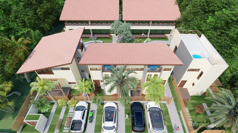 Vila de casas duplex de 1, 2 ou 3 suítes, apenas 100m da praia da Bombaça, com arquitetura praiana, mostra um ar de exclusividade com apenas 8 unidades em um bairro completamente residencial.